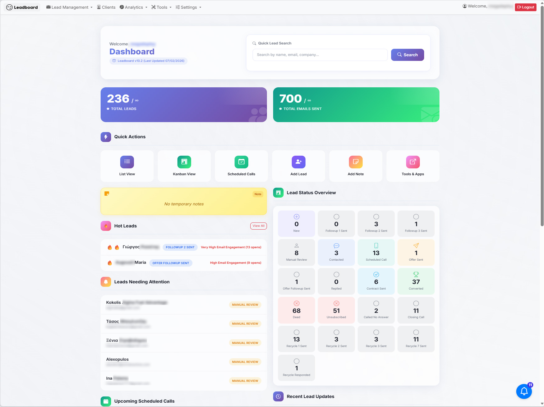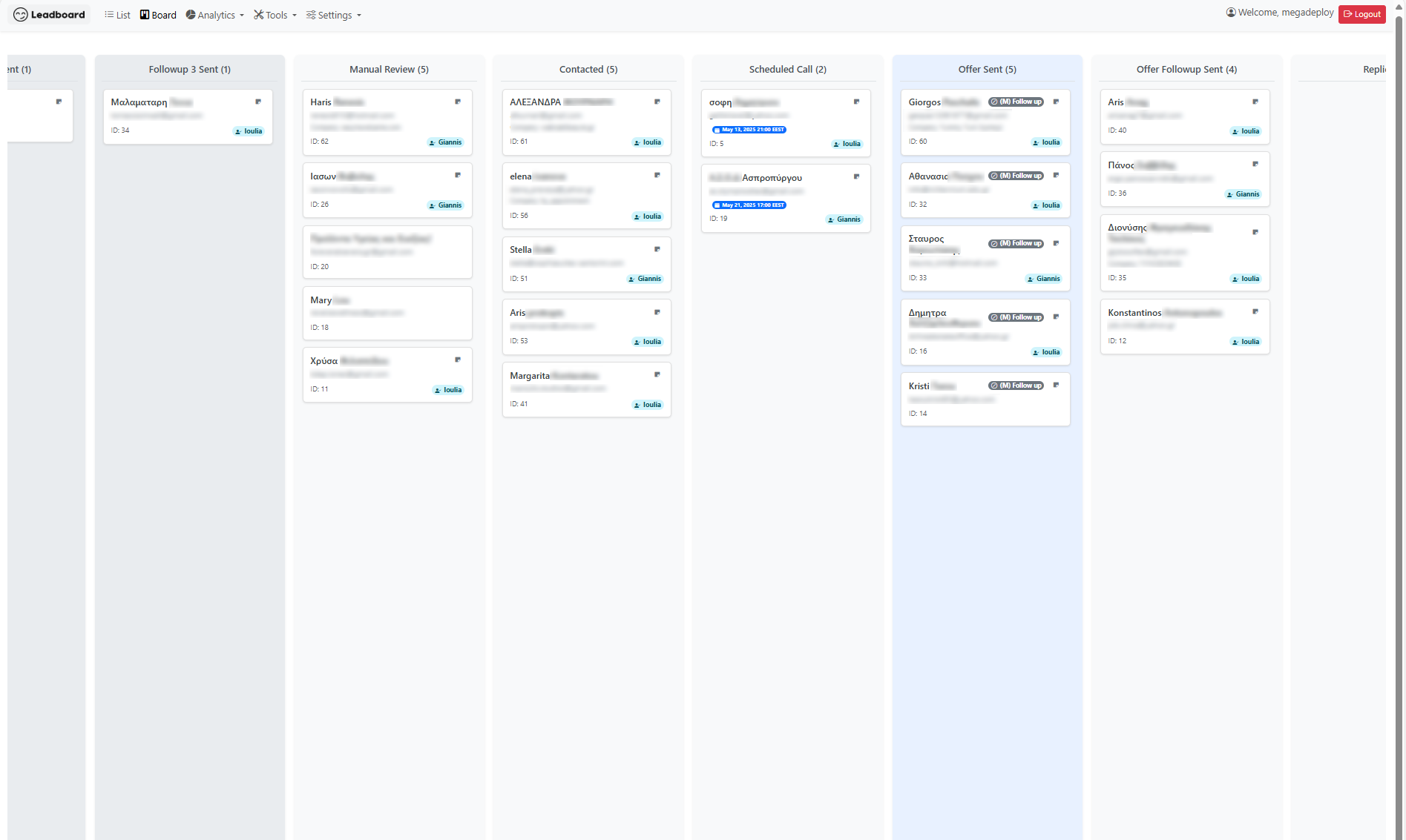 Ο πίνακας Kanban του LeadBoard σας δίνει πλήρη έλεγχο. Παρακολουθήστε τα leads σε κάθε στάδιο, αναθέστε εργασίες και δείτε την πρόοδο της ομάδας σας σε πραγματικό χρόνο.