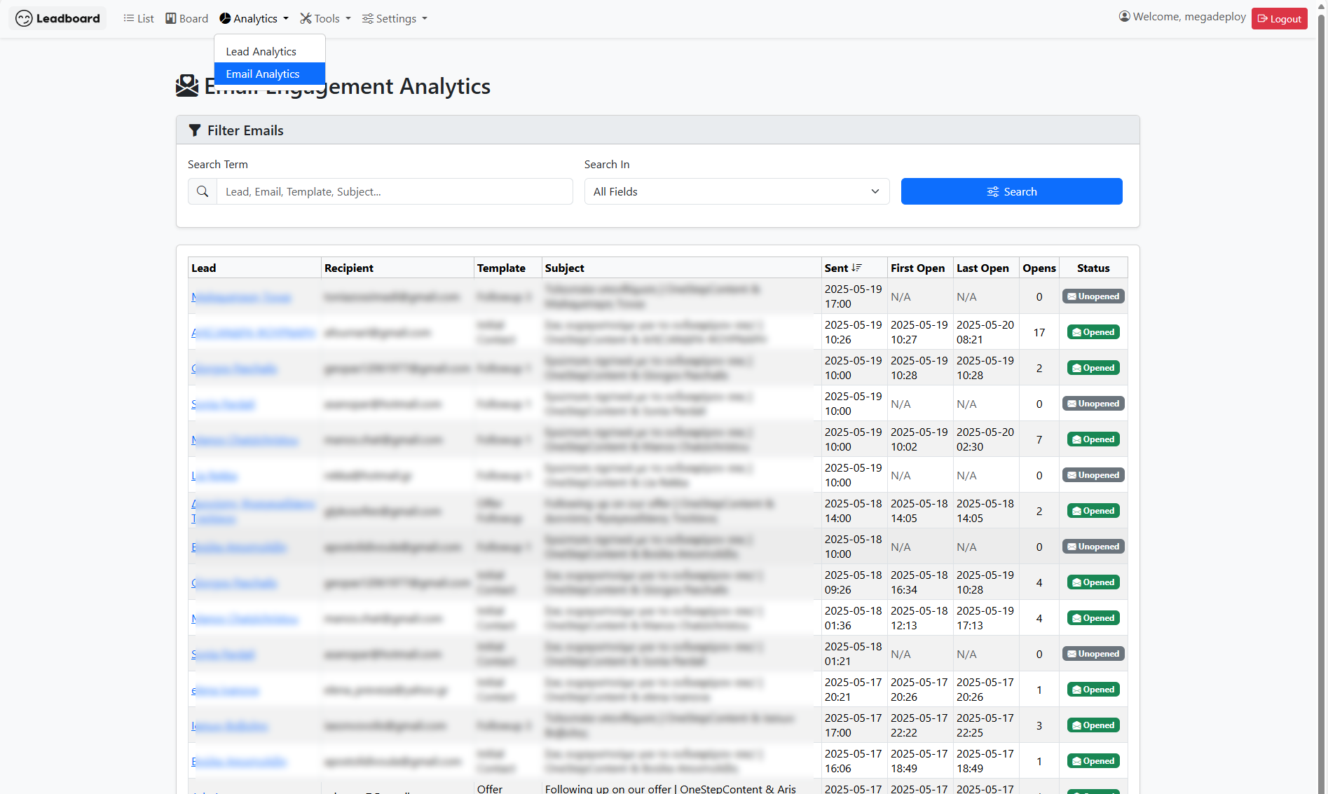 Με τα email analytics του LeadBoard, γνωρίζετε ακριβώς πόσοι άνοιξαν τα email σας και πότε. Αυτή η πολύτιμη πληροφόρηση (open tracking) σας βοηθά να βελτιστοποιήσετε τις καμπάνιες σας, να κατανοήσετε την αλληλεπίδραση των leads και να αυξήσετε την αποτελεσματικότητα της επικοινωνίας σας.